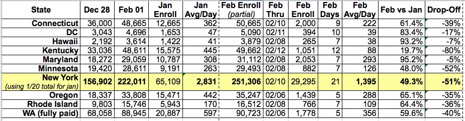 On the other hand, this data is still a bit spotty, as it only measures states representing 16% of the country, and only about 1/3 of the month at that. I'll keep an eye on the state-level data to see if any other states show better numbers; a small spike over January's enrollments from a state like California could negate the 10 states above in one shot.