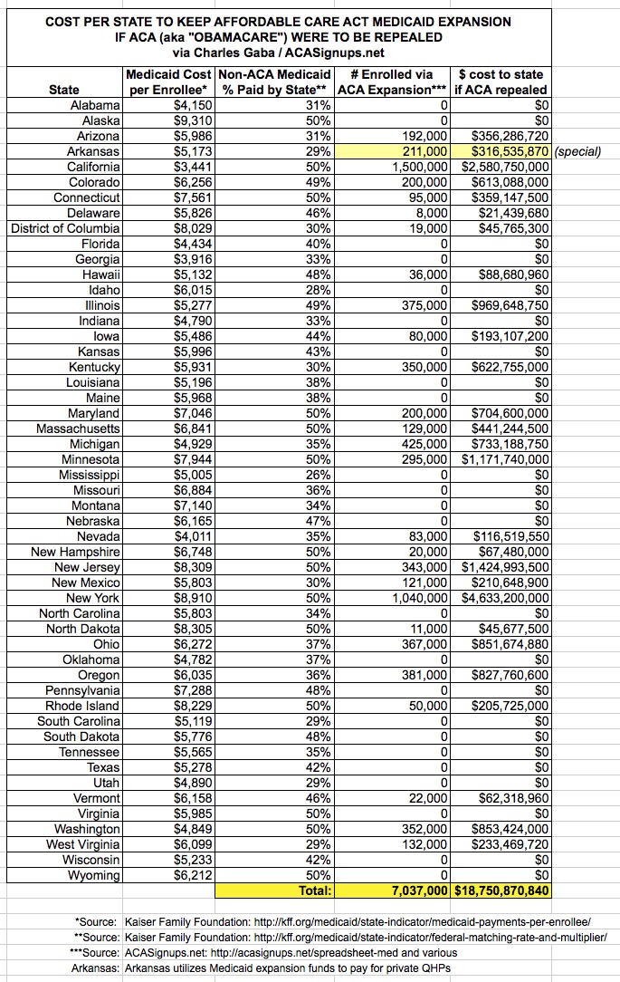 1) First, this only covers the Medicaid/CHIP expansion provisions of the ACA, not the tax credits being provided to around 6.3 million people nationally. If the ACA was repealed and the states wanted to keep those in place, they'd have to jack up taxes (or slash other budget items) even more.