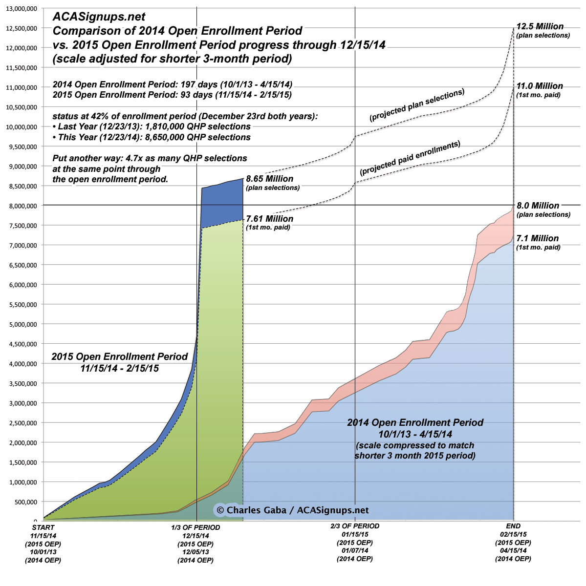 This Christmas Eve (I'm Jewish, so basically, you know, "Wednesday night" for me), I decided to run an updated version of the comparison, this time including the autorenewals along with other updated data. As a bonus, the dates even match up: December 23rd is 42% of the way through the 2015 OE period (39 days out of 93 total); December 23rd last year also happened to be 42% of the way through the 2014 OE period (84 days out of 197 total), so it seemed like a good point to run the comparison again.