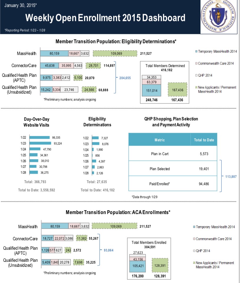 Massachusetts has now enrolled 3.6x as many people for 2015 via their exchange as they did last year, and there's still 17 days to go, including the final push. They averaged just 834 per day over the past week (understandable since most of it was after their monthly deadline). At that rate they would only add another 15,000 or so by 2/15, but I'm expecting 3-4x that number when the dust settles, or around 160 - 175K. This would be right in line with the exchange's own expectations (around 170K or so), which would be very impressive, but it would also mean that I was seriously misunderstanding how many people were stuck in MA's weird-ass "temporary healthcare purgatory" program.