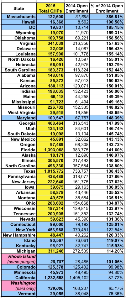 3) For Rhode Island and Washington, I'm using a different number than the other states; RI is the QHP selections, but after past-due non-paid ones have been purged from the total; in WA, they're only reporting the paid QHPs at all, so I don't know what the total selections are to begin with.
