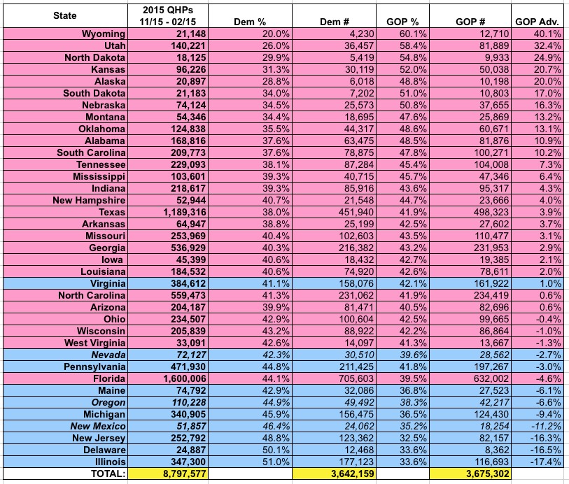 The other is, which I admit rather surprised me, is that the total enrolled populations of all 37 states combined is surprisingly close, with only a slight GOP-lean.