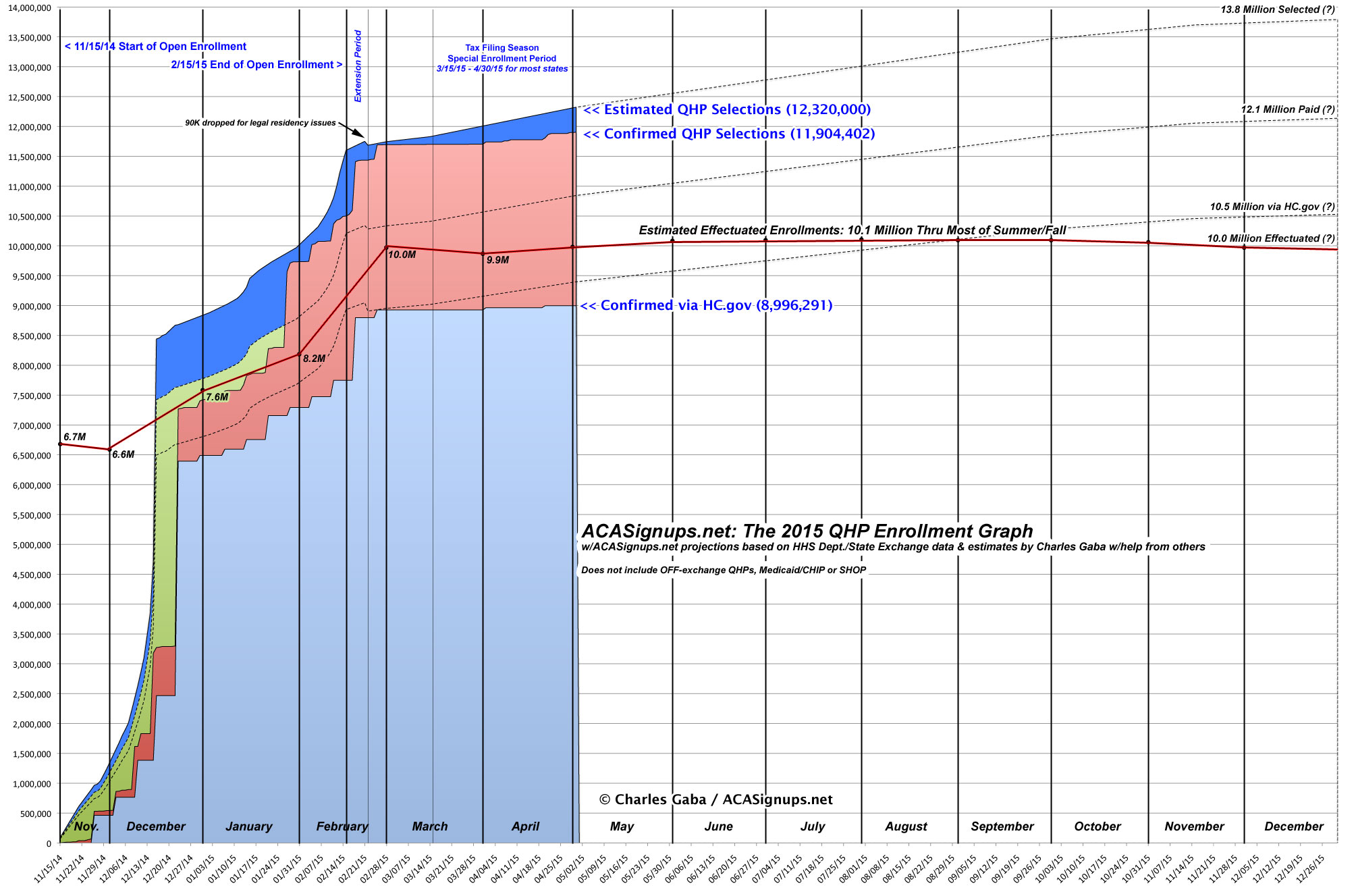 However, there's still no enrollment data since late February for about 10 states, and only fractional data for the other 40. Based on my best estimates, the actual total QHP selections to date should be slightly over 12.3 million as of yesterday (click image below for the full-size version).