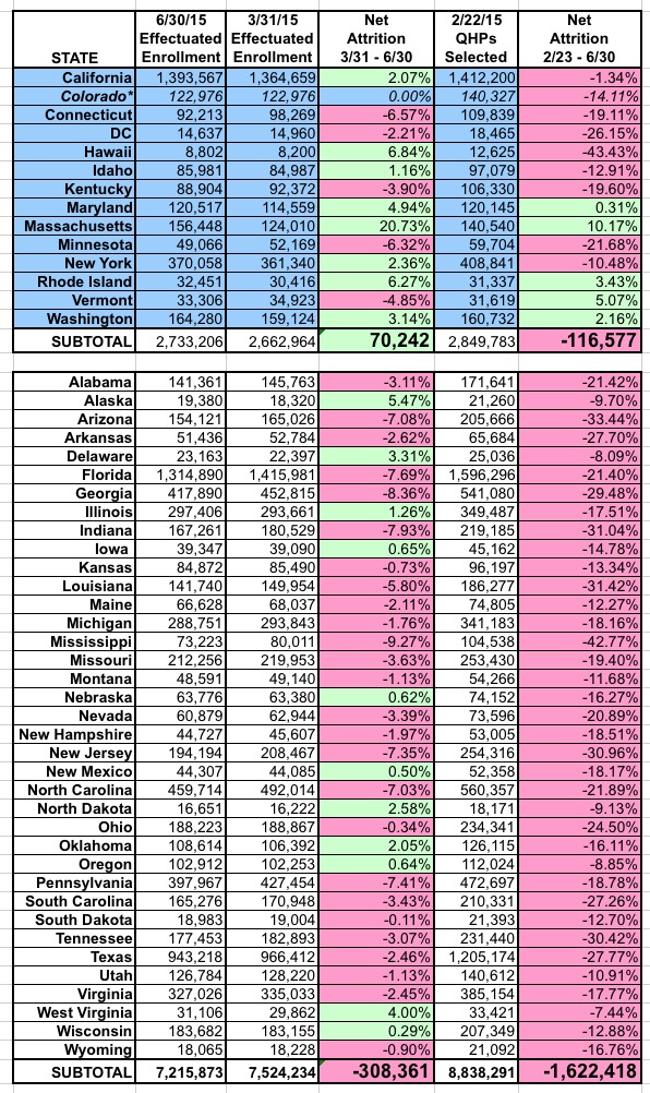 - Colorado's June number is listed as being identical to their March number because CMS was unable to verify their June enrollment and simply copied the March number over. Their unofficial June 30 figure is 134,200, or about 9.1% higher than it was on 3/31.