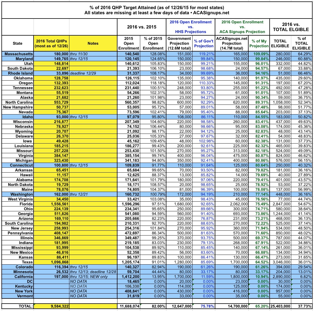 Overall, I've confirmed 9.6 million QHP selections nationally, but am pretty sure there's an additional 1.6 million already out there, likely as follows: