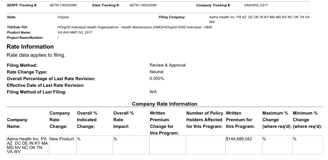 This would also explain why "Aetna Health Inc." is claiming to only be offering "new" products and therefore has "zero" current HMO enrollees; they do have a bunch of enrollees, but they're technically under the Coventry name, not "Aetna Health".