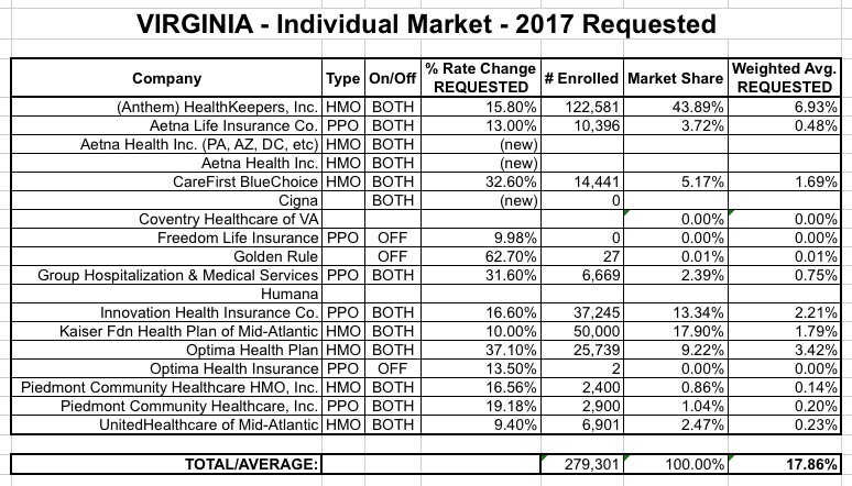 My point here is that NO, people should not start reposting the table above claiming that it automatically means Virginia residents are looking at 17.6% rate hikes. Just like early election results can change dramatically as more data comes in, the weighted average listed above will likely jump around a lot as the remaining carriers chime in...and then again when the approved rates are released.