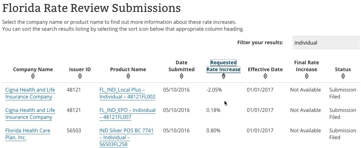 It's not just Indiana, either. Most of the state filings haven't been plugged into the Rate Review database yet, but Florida is showing some sub-5% hike requests as well, for instance:
