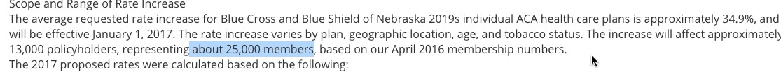 I suppose the other 100K or so might be found in United and/or Coventry (the latter of which enrolled nearly 33K last year), but until I know for sure, it looks like an ugly 35% average requested rate hike for the Cornhusker State: