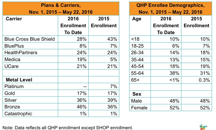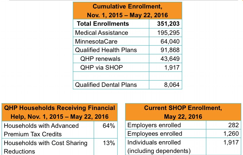 - 4/18/16 - 5/22/16: 91,868 QHPs cumulative since 11/01/15 (+1,172, or 33/day); 64,040 MNcare; 195,295 Medicaid