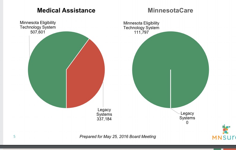 - The green pie charts below are a reminder that there are a lot more people who enroll in Medicaid via other means besides the exchanges; in addition to the 195K reported by MNsure, there are another 650K in Minnesota enrolled in the program.