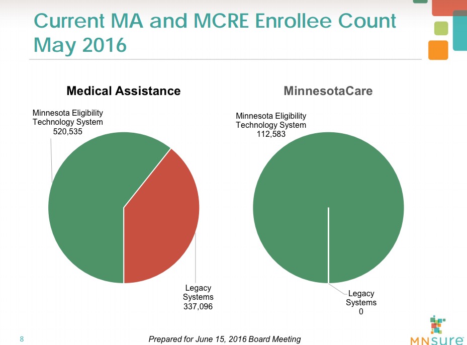 • 3/07/16 - 4/17/16: 90,696 (+3,840, or 91/day); 55,357 MNcare; 156,983 Medicaid