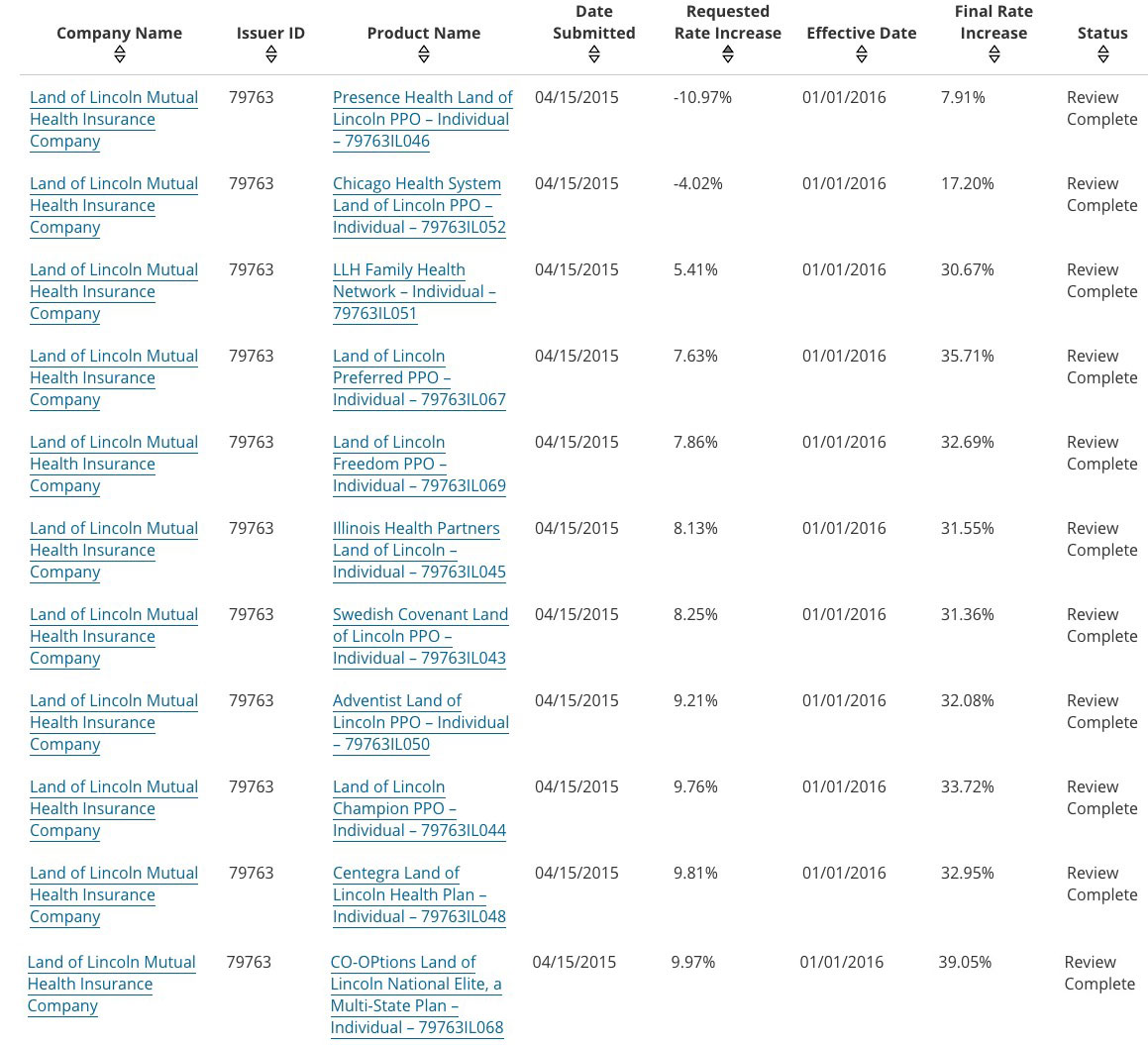 In case you're having trouble reading this, last year, Land of Lincoln requested rate changes ranging from an 11% drop to just under a 10% increase.