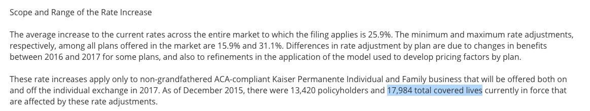 Meanwhile, Kaiser is asking for a still-unpleasant 25.9% hike, although the enrollment figure dates back to last December instead of the current number, which remains unknown.