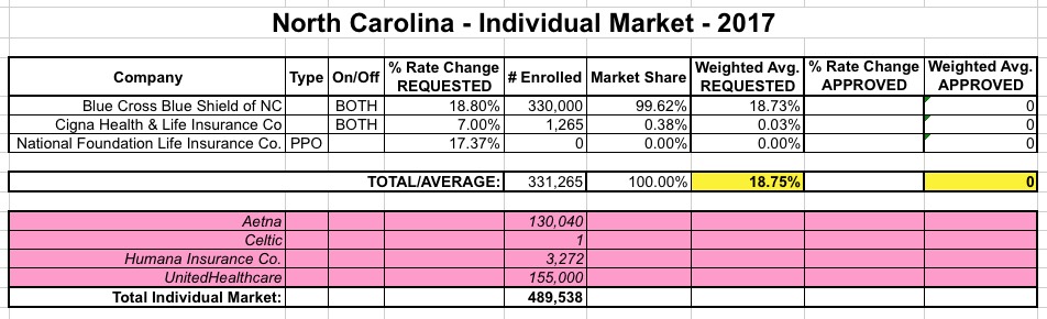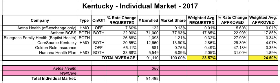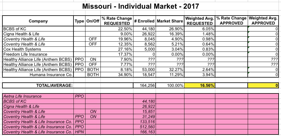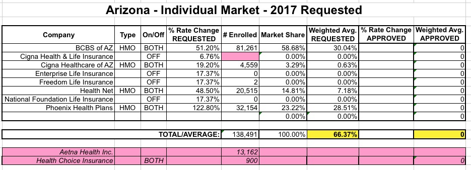 OK. Last week I wrote up a post speculating about the potential impact to the state- and national-level average rate hike requests of Aetna dropping out of the ACA exchanges in 11 states. My conclusion was that the average will increase in some states...but may actually drop in others, since Aetna would otherwise have asked for rate hikes higher than the average requested by the other carriers in that state. Of course, this isn't really a positive development, since their current enrollees are still losing their plans entirely, and since a 50% hike from Aetna could still end up costing less than a 10% hike from one of the other carriers...but as always, this is the best I can do here.
