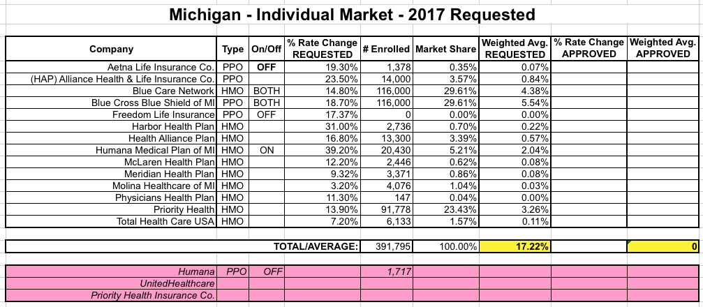 With that in mind, I've gone back and actually removed Aetna from a bunch of state spreadsheets to see what the hard impact is overall. In addition, I've also cleaned up the tables for some other states to remove smaller carriers who have announced that they're dropping out as well. For instance, in Michigan, Priority Health Insurance is out (but Priority Health HMO is still in). In New Mexico, Presbyterian is off the exchange. In Texas, Scott & White is out, and so on.