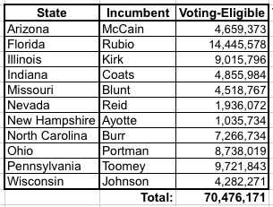 Next, I've looked up the total number of registered voters in each state (note: these numbers are as of this past spring during the presidential primaries, and count the number of residents eligible to vote, not necessarily registered to do so...although more people have been registered since then and will continue to do so thorugh early November).