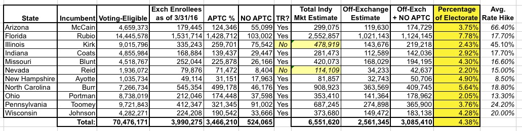 If I don't include them, I'm looking at about perhaps 9 million people in all. Now, of those who enrolled on the exchange, about 8% are children under 18 who can't vote. Assuming the full-price/off-exchange crowd has a similar age makeup, let's knock 8% off the total and call it perhaps 8.3 million people nationally who a) are enrolled in individual, ACA-compliant healthcare policies but who b) are paying full price for them, either on or off the exchanges.