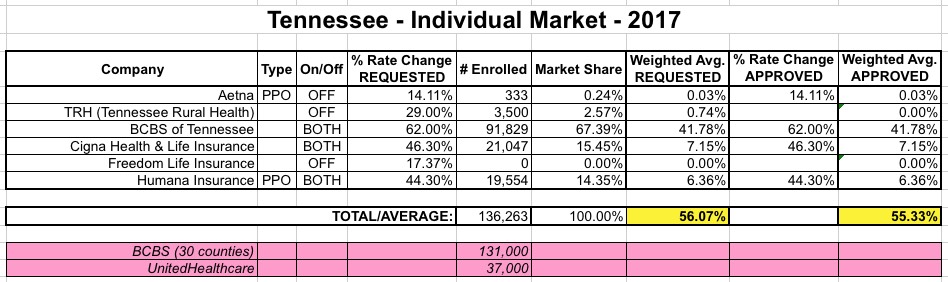 Bluecross BlueShield of Tennessee is pulling out of three regions in 2017 for their individual/marketplace plans.