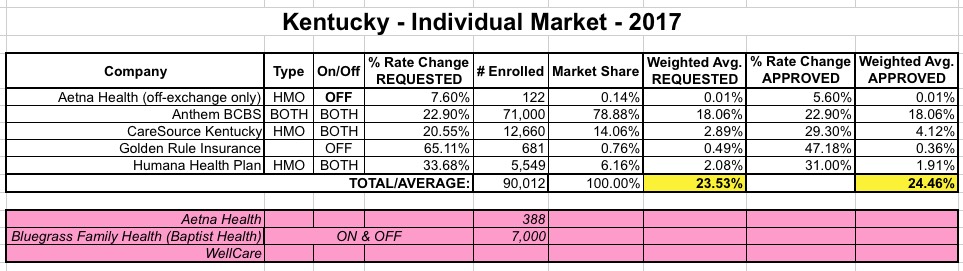 In other words, Baptist is dropping out of the entire individual market, both on and off-exchange. My last estimate of Kentucky's weighted rate hikes had Baptist down as only having around 1,100 individual enrollees, but it's possible that the other 5,900 were in plans which were being discontinued anyway.
