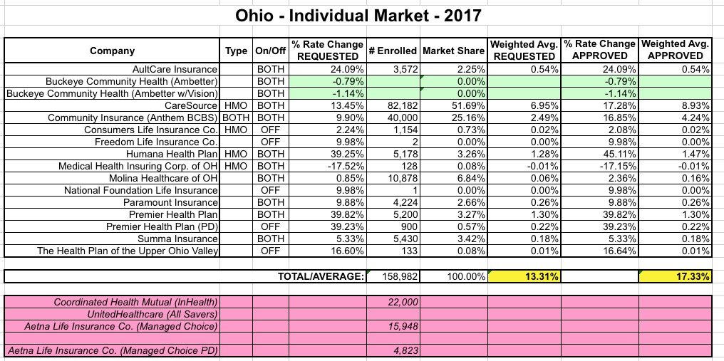 • OHIO: This is another of the 5 missing "approved" states. Unfortunately, there's one key number missing from my Ohio spreadsheet: I have no idea how many people are actually enrolled in Buckeye Community Health plans. This is important because unlike most carriers, Buckeye not only requested rate reductions, they actually received them. If a large number of Ohio residents are enrolled in Buckeye plans, that could lower the statewide weighted average significantly.