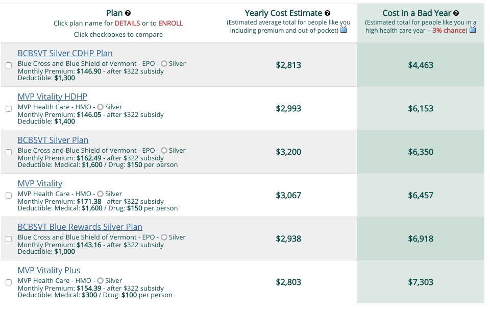 (sigh) Aside from Ms. Tyce-Royea's cringe-inducing lack of understanding about how insurance works, out of curiosity, I decided to take a look at her situation by plugging her info into the Vermont Health Connect ACA exchange website.