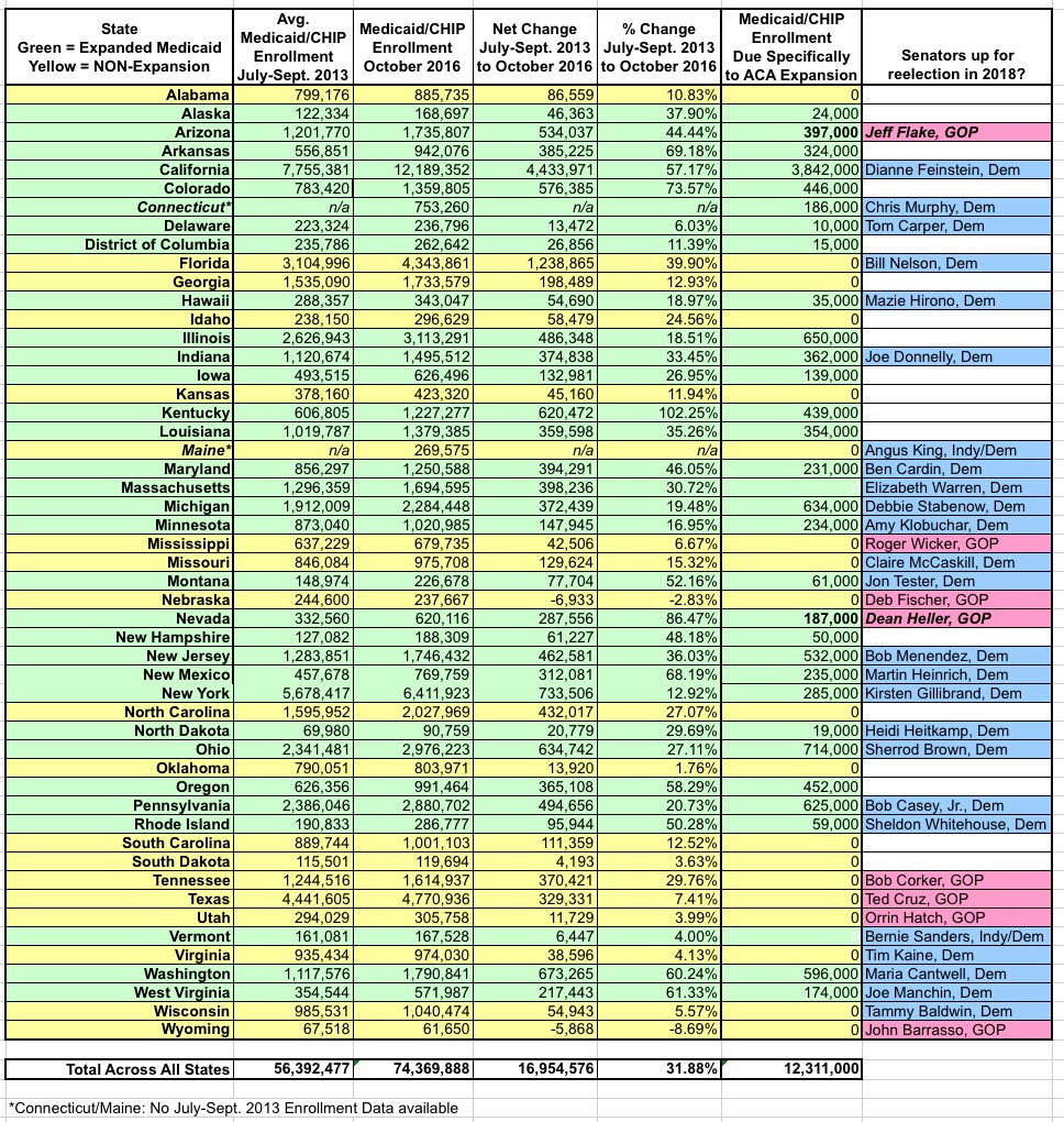 I've also listed which U.S. Senators are up for re-election in each state in 2018. As you can see, Republicans Jeff Flake (Arizona) and Dean Heller (Nevada) will be under tremendous pressure not to repeal the Affordable Care Act; nearly 6% of Arizona's entire population and 7% of Nevada's are enrolled in Medicaid specifically due to the ACA.