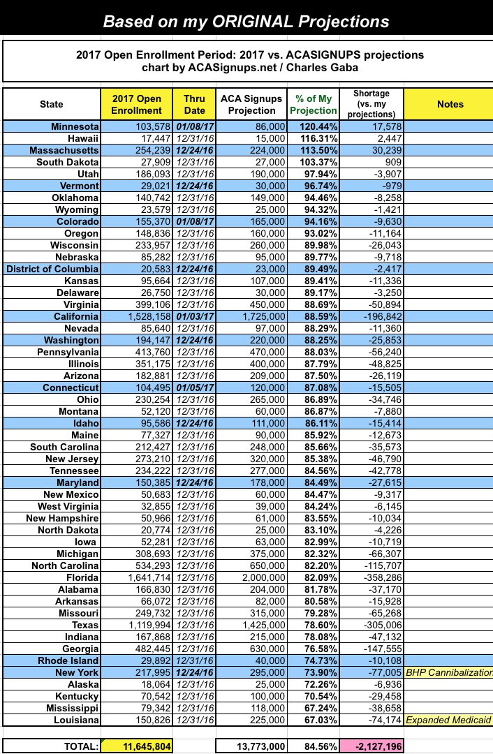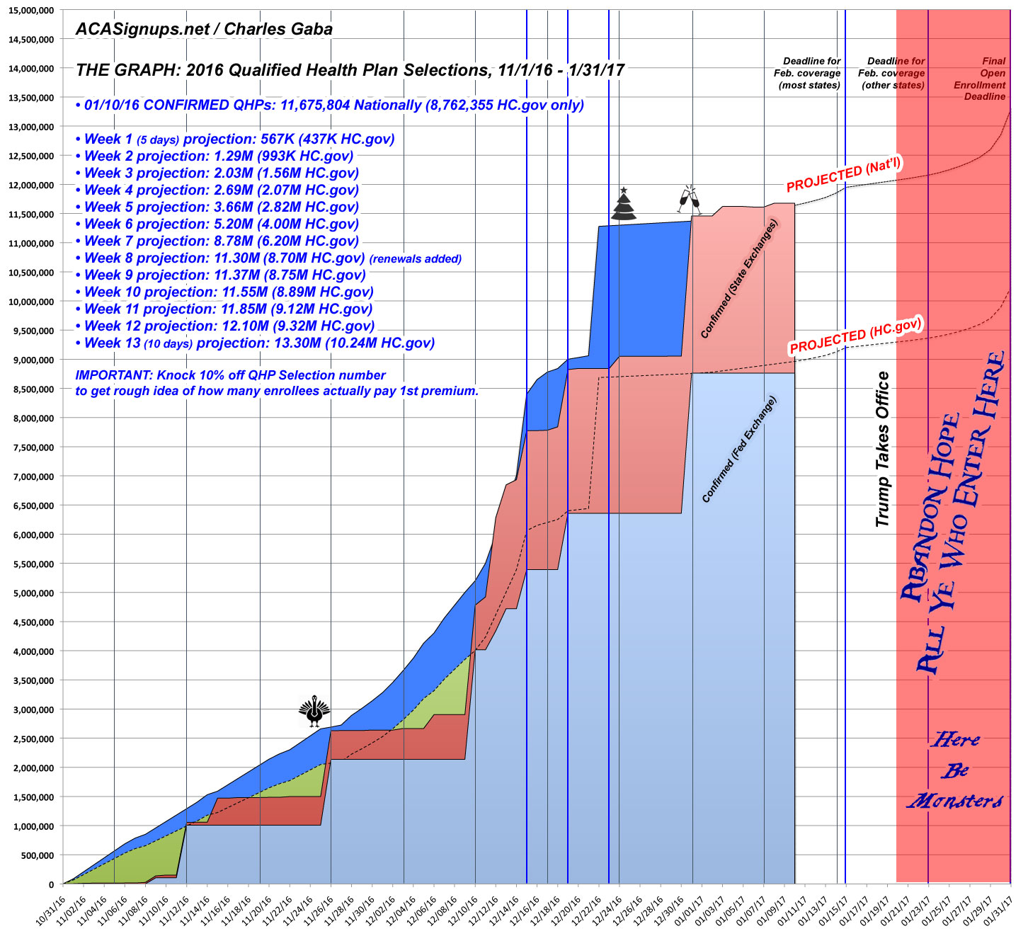 The problem is that there's another 28 states which are below the 87% threshold, including some big ones like Texas and Florida. Every state should be at roughly 89% by now in order to hit my national target of 13.8 million enrollees. There would have to be around 2.1 million additional new enrollee signups during January to pull this off; I just don't see that as being very likely at this point unless there's a massive "Holy Crap, Donald Trump is really President!" panic over the final 11 days.
