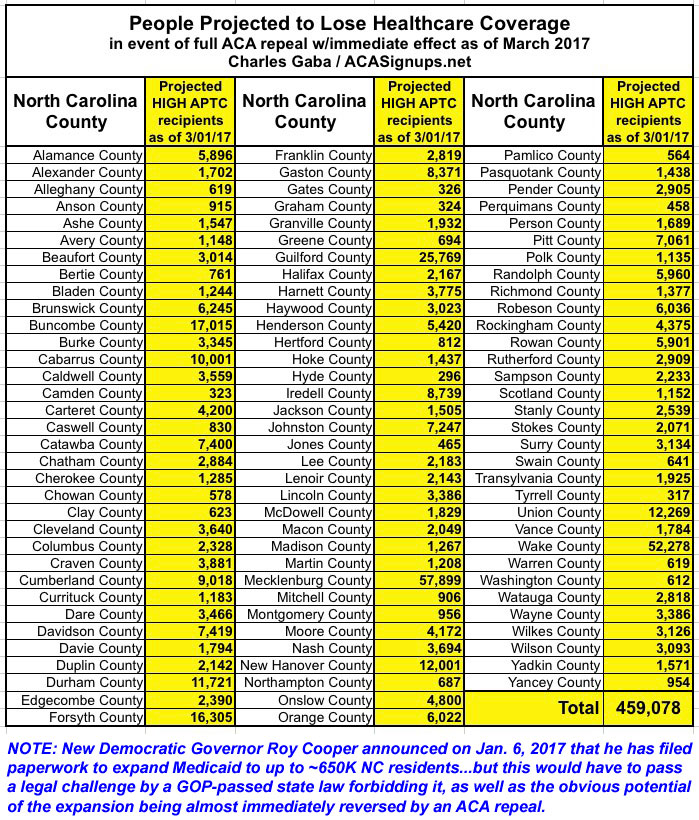 In the case of North Carolina, assuming 626,000 people enroll in exchange policies by the end of January, I estimate around 459,000 of them would be forced off of their policy upon an immediate-effect full ACA repeal.