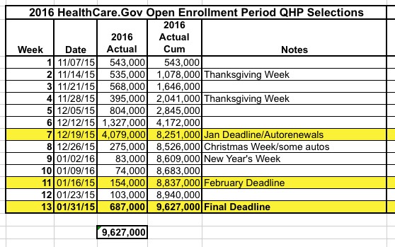 I can't really use the 2014 Open Enrollment Period to compare with for several reasons: For one thing, it lasted 6 full months instead of 3; the massive technical problems at launch meant that enrollments were artificially end-loaded; and there was a 2-week "overtime" period tacked onto that as well.