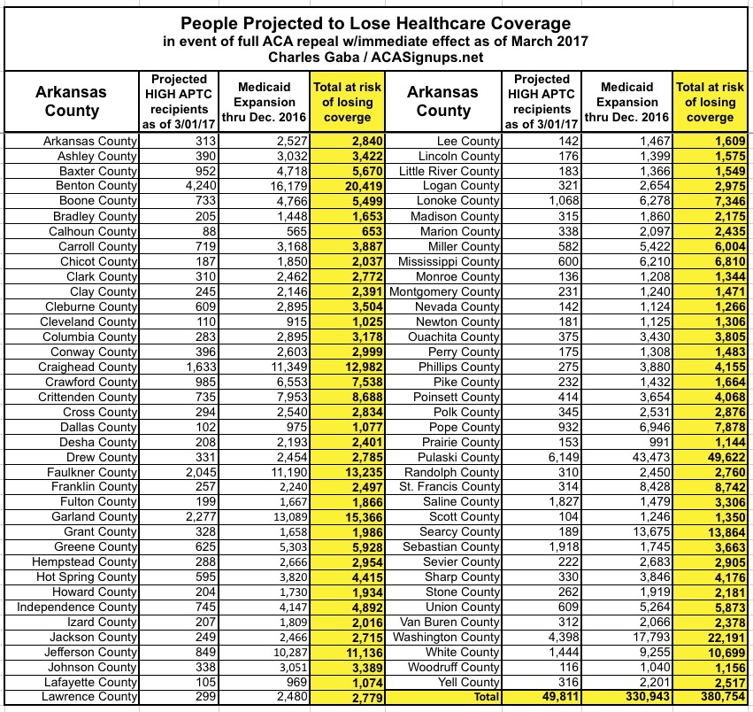 In Arkansas, 70,404 people enroll in private exchange policies as of the end of January. I estimate around 50,000 of them would be forced off of their private policy upon an immediate-effect full ACA repeal, plus another 331,000 enrolled in Arkansas' "Private Option" ACA Medicaid expansion program for a total of 380,000 residents kicked to the curb.