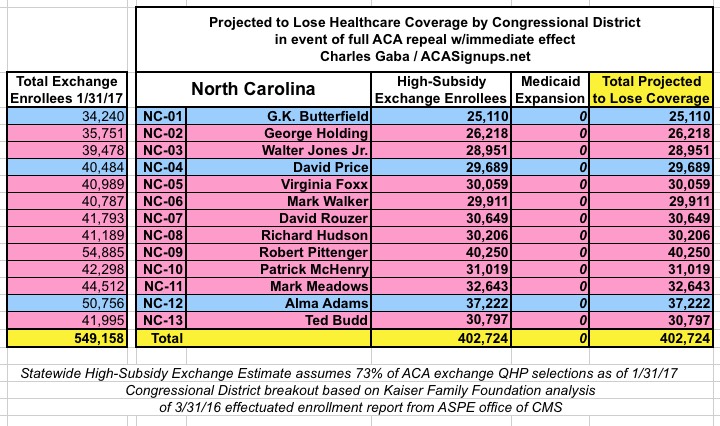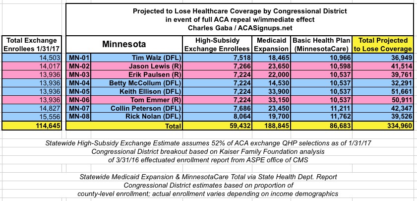 The amazing thing is that the grand total number losing their coverage would be virtually identical in either scenario! The numbers vary widely from state to state and district to district, but when you add it all up, it still comes in at around 24 million people either way!