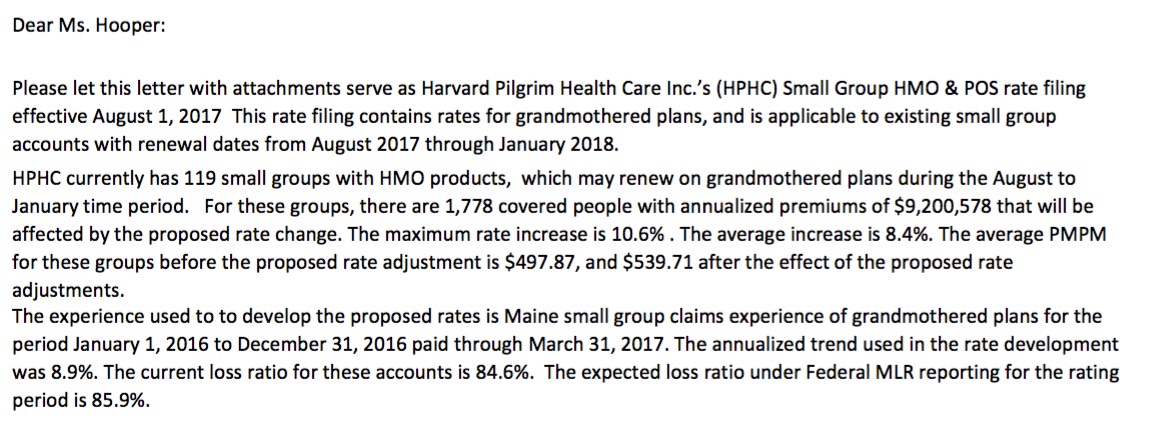 MAINE: Nothing major here, just noting that Harvard Pilgrim has filed rate increase for their transitional, small group policies effective August 1st: