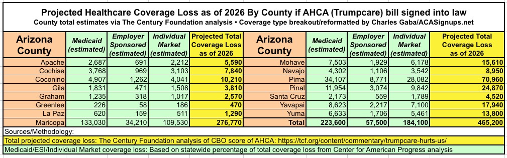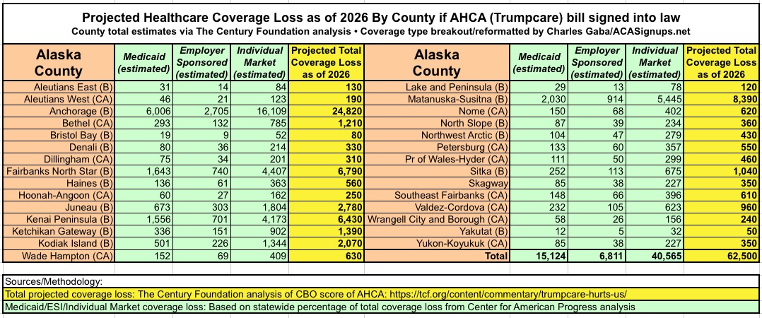 With that in mind, here's the County Level breakout of the Century Foundation's projections of how many people would lose healthcare coverage by 2026 under the GOP's AHCA bill. The yellow columns (Total) come directly from TCF's analysis; the green columns (type of coverage loss) are my own proportional estimates within those totals.