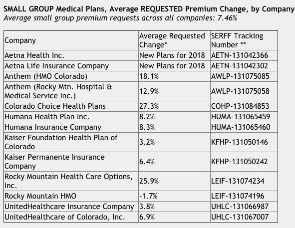 All of the insurance companies have requested premium increases for their plans in the individual market for 2018. For individual plans, the average premium request across all companies is 26.96 percent. In the small group market, the average premium request across all companies is smaller, 7.46 percent. These are averages across all of the plans a company is offering, across all areas of the state where a company offers plans, and for all ages. These do not represent how one person’s premium could change.“Remember that these are only what the companies have requested and are not the final premiums,” noted Commissioner Salazar “The companies must justify their premiums to the Division of Insurance, and our staff will review those justifications over the summer.