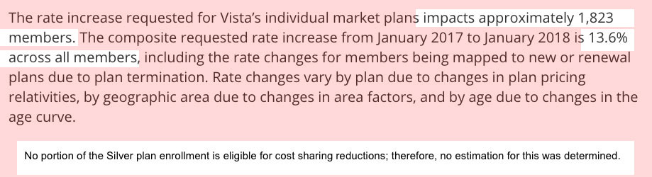 Anyway, I've managed to plug in one hard request percent for each carrier--the FULL Trump Tax for 3 of them, the NO/PARTIAL Trump Tax for most. In Vista's case, they're off-exchange only so the CSR issue isn't a factor anyway. Unfortunately, I can't seem to find the enrollment number for Community Health Choice, so I don't know what their share of the market is, which could make a big difference if they have high enrollment. I've plugged in a flat 100,000 enrollees for the moment, but will change that if I'm able to track the actual number down.