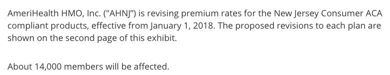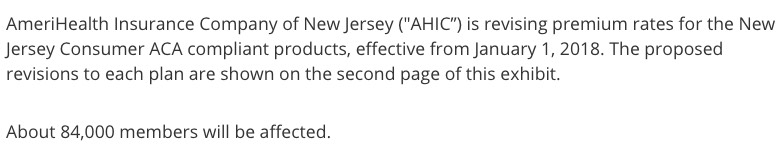 I had already posted a partial look at the New Jersey rate hike situation a couple of weeks ago with a video in which Topher Spiro of the Center for American Progress interviewed NJ Congressman Frank Pallone about the situation. Since his comments weren't official and only referred to Horizon Blue Cross, I didn't make it an official part of the Rate Hike spreadsheet, but now I've managed to plug in the remaining carriers and here's how it looks. As expected, with Horizon holding a commanding 70% market share, the statewide average is around 8.5% if CSR payments are made and the mandate is enforced versus 21.6% if CSR payments aren't made and the mandate isn't enforced.