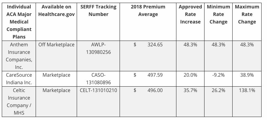 The Indiana Dept. of Insurance has posted the approved rate hikes for the three carriers participating in the ACA-compliant 2018 individual market: