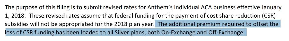 ...which means that Kentucky's CSR Load strategy status is actually either "Silver Load" or "Silver Switcharoo". However, Anthem's filing clearly shows that they went the "Silver Load", adding the CSR surcharge to all Silver plans, on & off exchange: