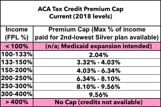In any event, one of the biggest flaws with the ACA itself is that the formula and rules for individual market tax credit eligibility are, quite simply, too stingy. They only apply to those falling within 100-400% of the Federal Poverty Level (roughly $12,000 - $48,000 for a single adult, or $24,000 - $96,000 for a family of 4), Within that income range, subsidies drop off on a sliding scale, based on what percentage of household income the benchmark Silver policy costs. Here's the official chart for 2018 (the percentages change very slightly from year to year based on some IRS formula):