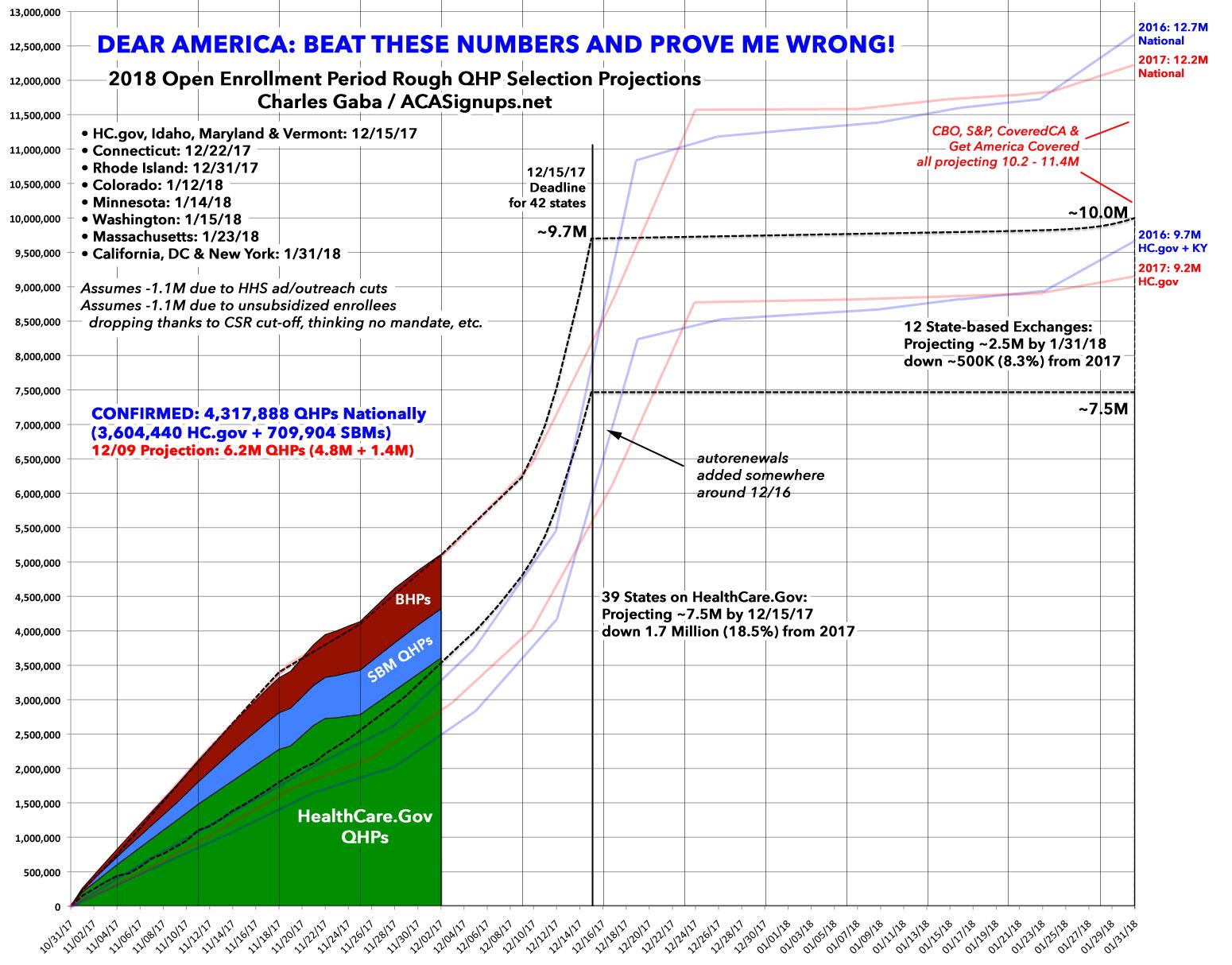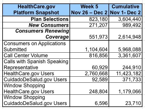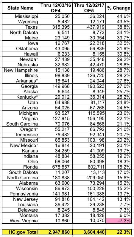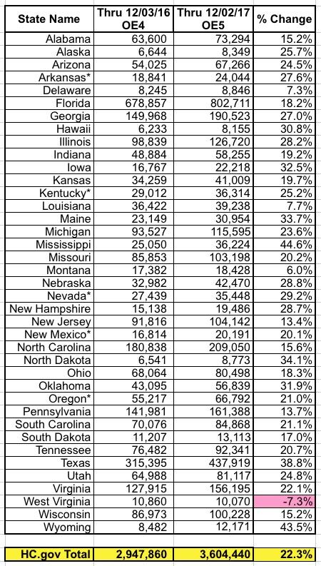 Nationally, there were 5.21 million QHP selections as of December 3rd last year. I'm missing a lot of SBM data, but I estimate another 1.8 million QHPs via the 12 SBM states through December 2nd this year; if so, that would give a grand total of 5.4 million.