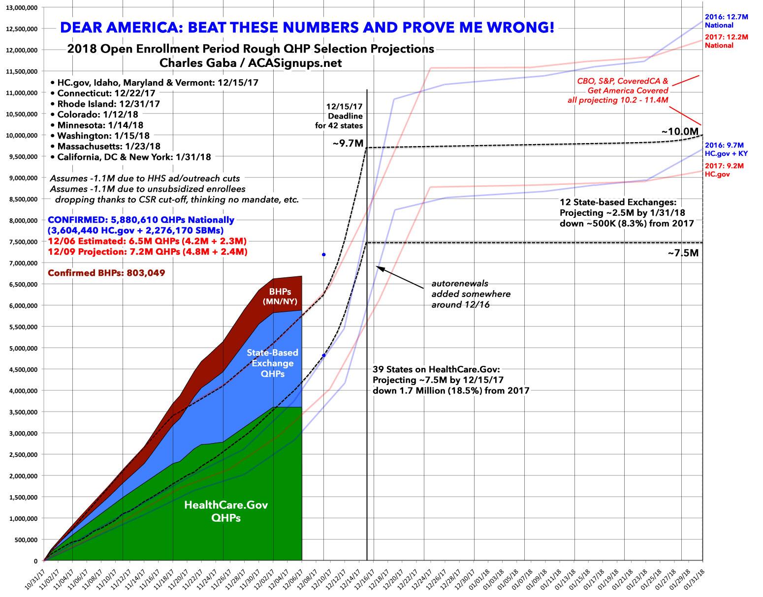 With all of these plugged into The Graph, I've now confirmed 5.58 million 5.9 million QHP selections nationally through December 6th: 3.6 million via HC.gov and another 2.0 million 2.2 million in the 12 State-Based Marketplaces (SBMs).