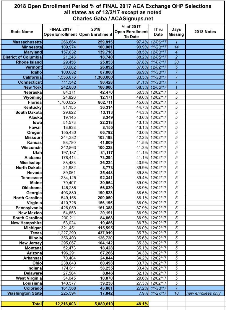 UPDATE 12/7/17: Small update out of New York: 166K QHPs thru 12/06