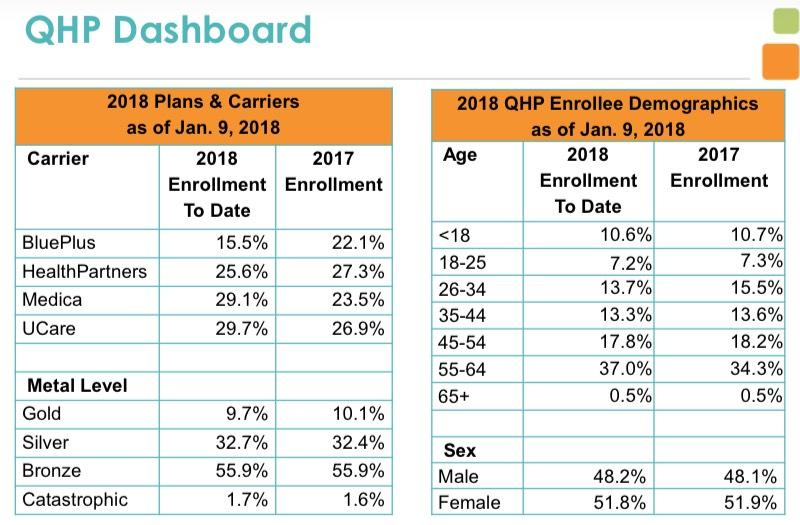 Minnesota loaded their CSR costs onto on-exchange Silver plans only, so they technically fall under the "Silver Switcharoo" category...but only a 11.1% of exchange enrollees receive CSR assistance in the first place in MN due to the MinnesotaCare program cannibalizing most potential CSR recipients, so there simply isn't that much CSR cost to load. As a result, there's been almost no metal level shifting in Minnesota. The market share between carriers has jumped around a bit. The age brackets have also shifted a bit, but not for the better: 18-34 year olds went from 22.8% of all enrollees last year to 20.9% so far this year. However, younger enrollees tend to wait until the last minute, so the final enrollment surge over these final 5 days could shift those numbers back.