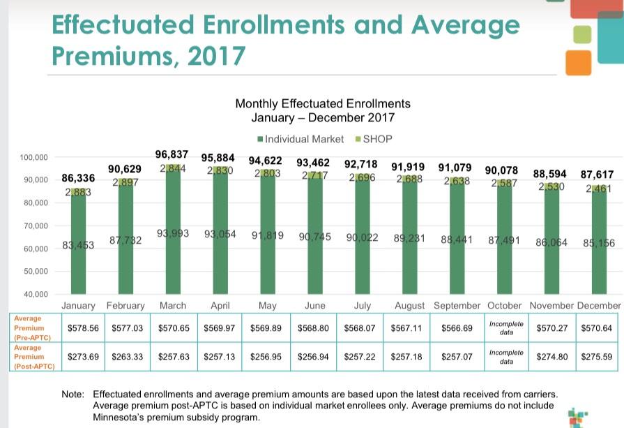 THIS is the type of granular data which is difficult for me to come by: Effectuated enrollments by month. When you ignore the SHOP numbers (Minnesota is among the few states which even bother reporting SHOP enrollees), individual market QHP effectuations averaged 88,933 per month in 2017. When compared against the 114,810 total QHP selections during OE4, that's an average effectuation rate of 77.5%...which is slightly below the 2016 national average of 78.9%.