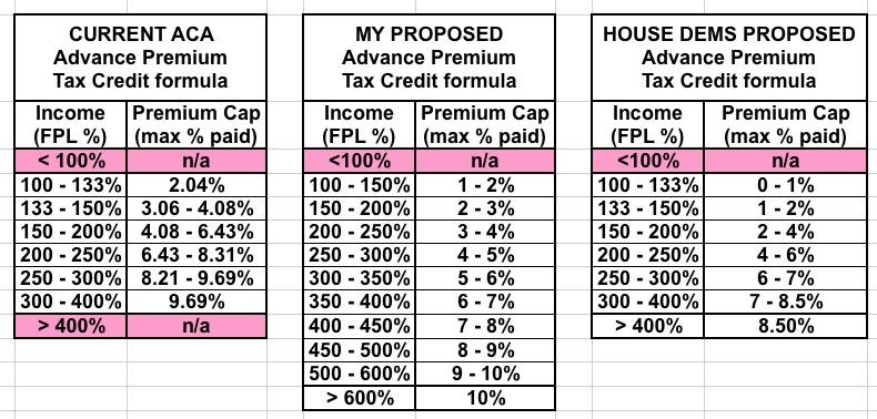UPDATE: OK, here's the revised APTC formula being proposed, compared against the current ACA formula and my own proposal from last year. As you can see, the House Dems are proposing to make tax credits even more generous than I had suggested at most income levels, with a maximum cut-off point of 8.5%: