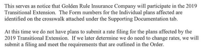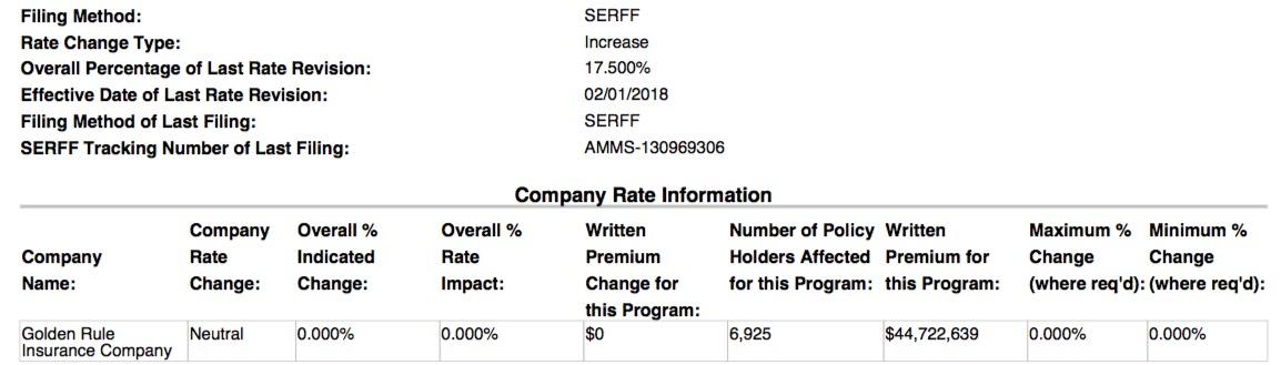 At first glance, it looks like after raising premiums by 17.5% this year, Golden Rule isn't changing their prices a bit in 2019. However, the cover letter clarifies that they may do so later; they appear to just be getting the rest of the paperwork in order at the moment: