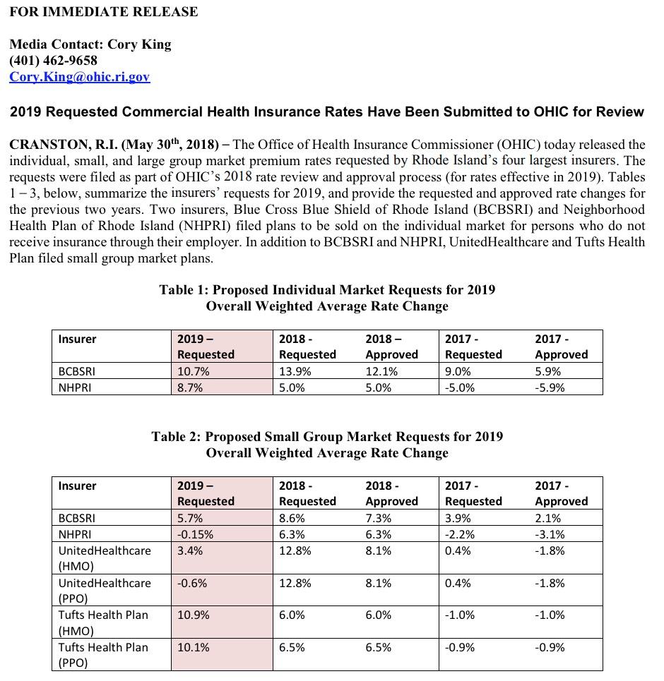Rhode Island is the 5th state (to my knowledge) to officially post their preliminary 2019 individual market rate change requests.