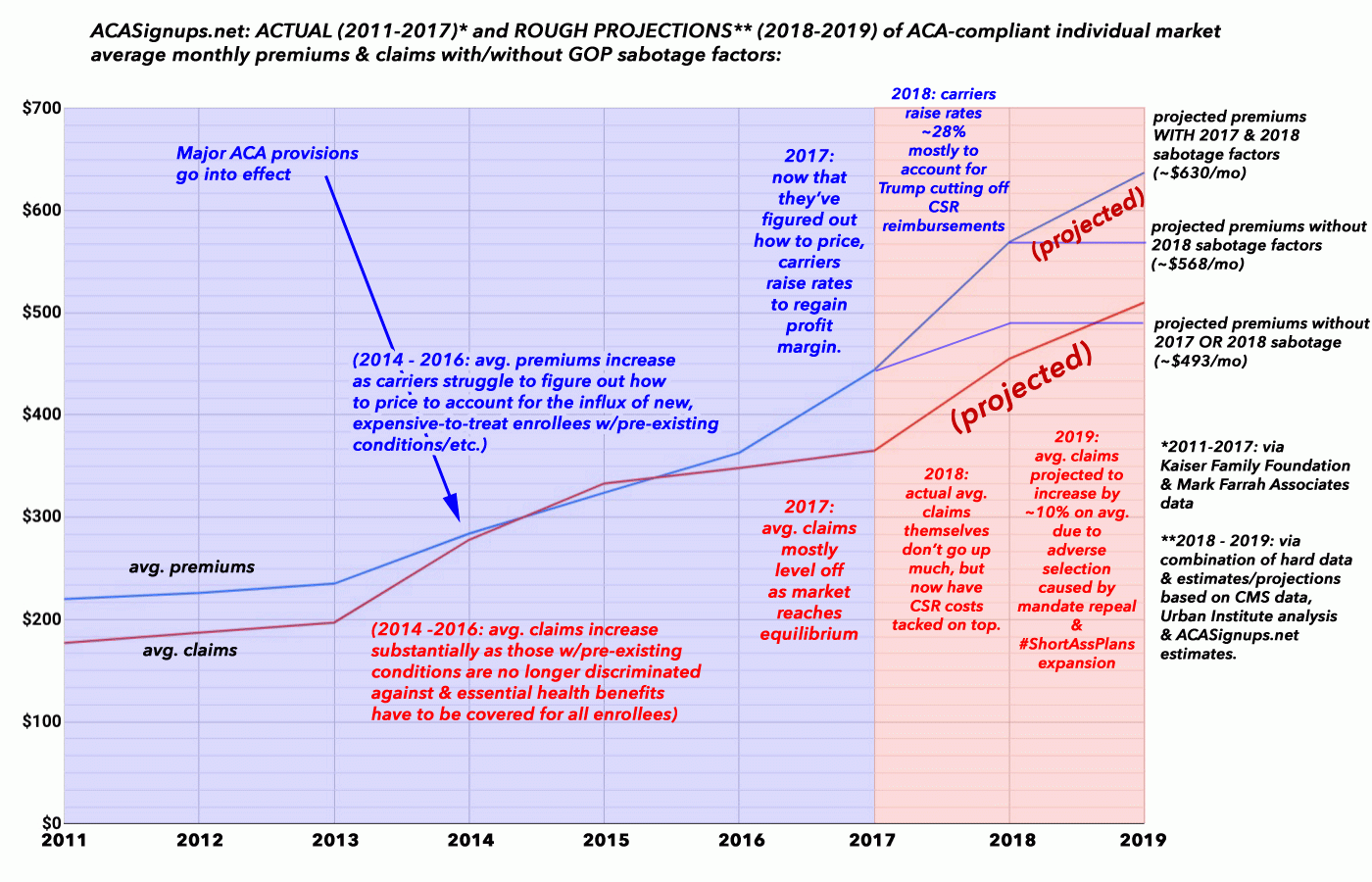 This will obviously change as more hard data is plugged in, but as far as I can tell, if it weren't for both 2017 and 2018 sabotage efforts by Trump and the GOP, 2019 rates would be averaging around $493/month per person. If it weren't for 2018 sabotage only, 2019 rates would likely be around $568/month. Instead, with both years worth of sabotage factored in, unsubsidized premiums will likely come in at around $630/month next year...fully $137/month more than they would if not for the 2-year onslaught. That's over $1,600 more per enrollee for the full year. If you only compare against 2018 sabotage, it'd be around $62/month more, or around $740/year...which is right in the midrange of the table below:
