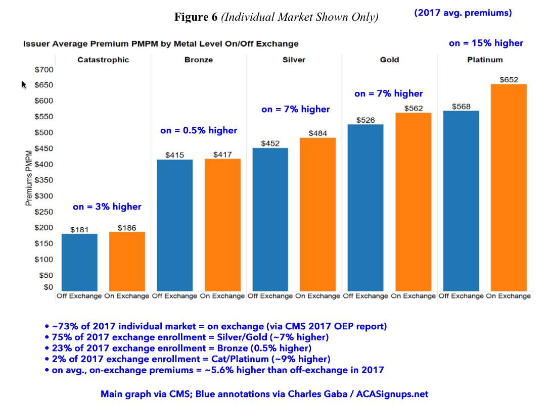 This chart compares the average monthly premium for 2017 individual market enrollees both on and off the ACA exchange. This is important because while there's all sorts of data points available for on-exchange enrollees, the off-exchange market has always been a lot more difficult to get info about.
